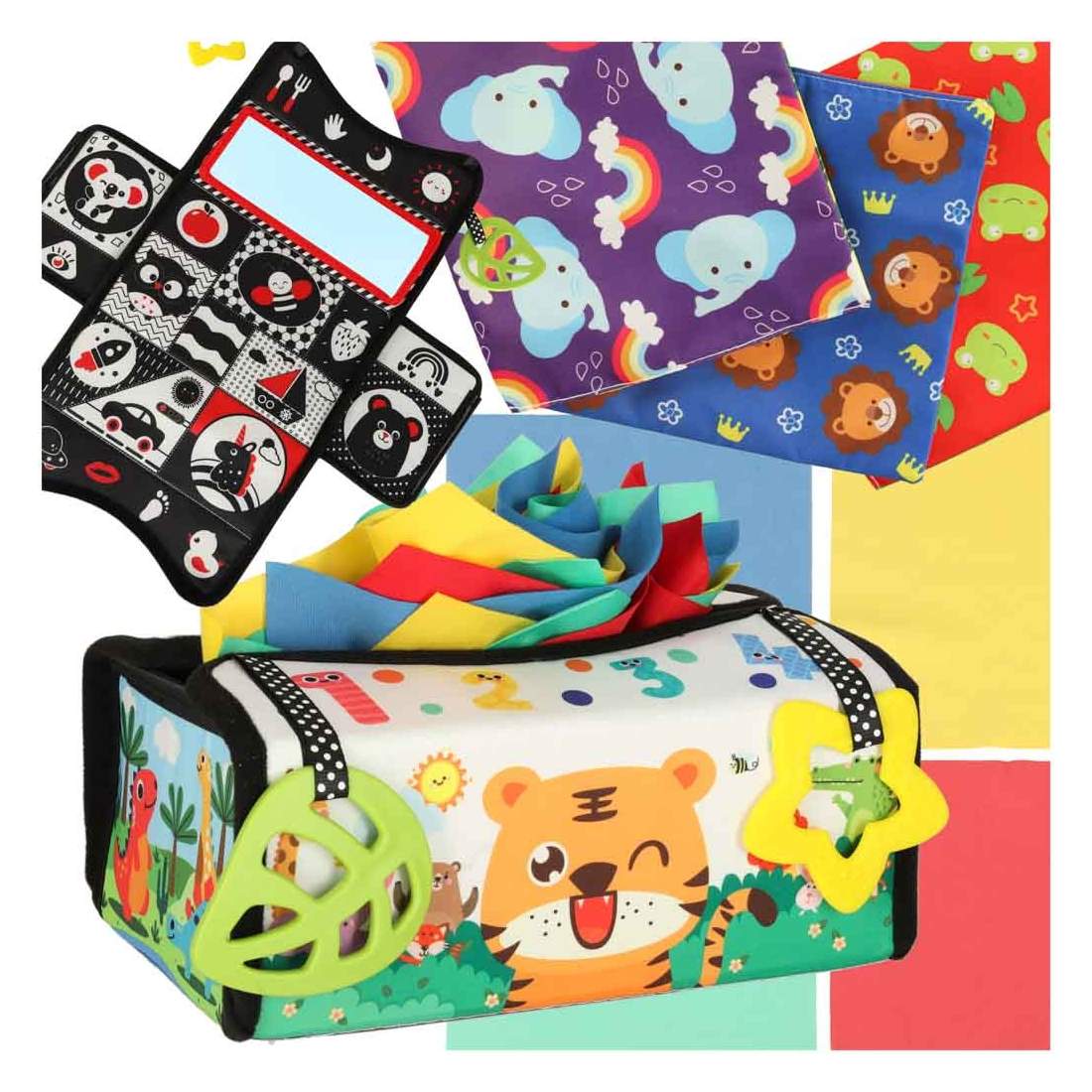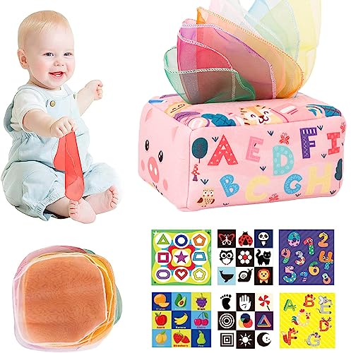 Vicloon Baby Tissue Box leksak - Montessori Sensory Toy med 6 krinkel papper och 20 färgglada sidenscarfar, 6 månader