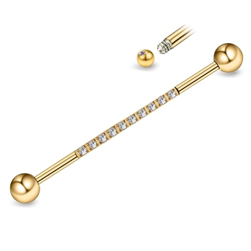 FINE4U Guld industriella piercingsmycken 14G 36 mm 38 mm 1 st – ASTM F136 titan industriell skivstång, industriella örhängen, broskkroppspiercing smycken med CZ, 14G(1.6mm), 1 & 1/2" (38mm), Kubisk