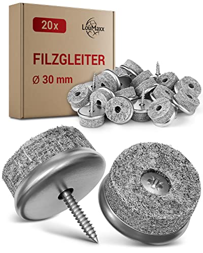 LouMaxx Stolsfiltglidare, runda skruvar, Ø 30 mm, grå – stolglidare med 6 mm tjock filt och metallinfattning – filttassar för stolskruvar – premium stolsbenskydd, filt, även för möbler, 20 stycken