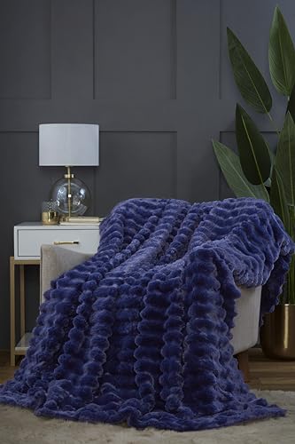 Rapport hem falsk kaninpäls mjuk beröring tjock ribbad blå filt överkast (150 x 200 cm)