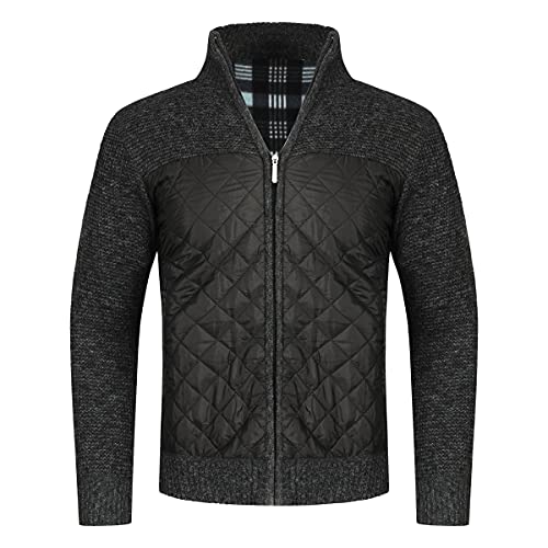 YOUTHUP Stickad cardigan för män, fleecefodrad tjock tröja, hel dragkedja, ståkrage, koftor, Svart, 4XL