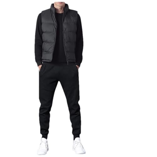 ZMIN Herrkläder set 3 delar träningsoverall män sport fleece tjock huva män jacka + byxor + västar vinter tröja, Fleece svart, M
