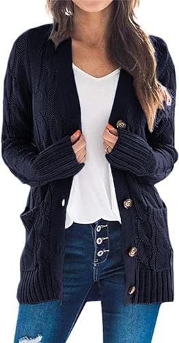 Placitiume Dam tjock kabelstickad cardigan mode knapp ner tröja med öppen framsida kappa, Marinblått Xsp, M