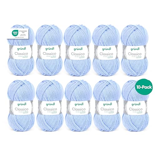 Gründl ull Classico – tjock ull för stickning och virkning – stickgarn – mjuk och hudvänlig – 50% merinoull, 50% polyakryl – 10 nystan 50 g/120 m – nåltjocklek 3,5 – 4,5 – ljusblå