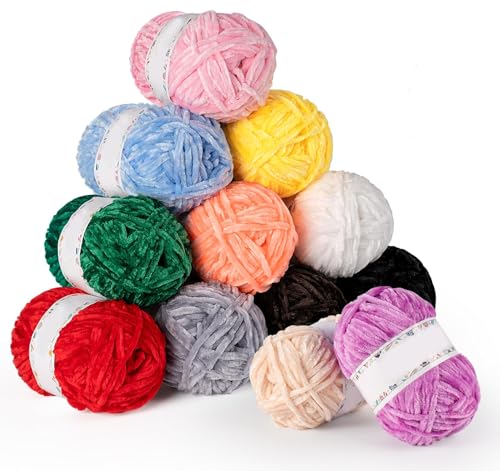 12 x 50 g chenille-ull för virkning, mjukt chenille-garn, garn för stickning med virkade tillbehör, premium tjock ull för kläder, filtar, väskor