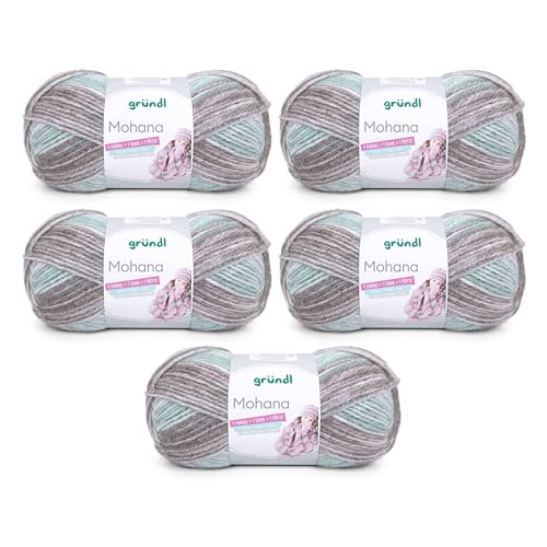 Gründl Ull Mohanna stick- och virkgarn tillverkat av 90% polyakryl, 10% mohair, 5 x 100 g, tjock ull, ljusgrå-mintnatur-vit