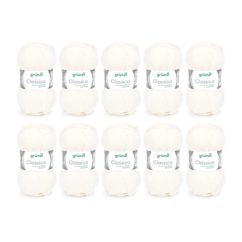 Gründl ull Classico – tjock ull för stickning och virkning – stickgarn – mjuk och hudvänlig – 50% merinoull, 50% polyakryl – 10 nystan 50 g/120 m – nåltjocklek 3,5–4,5 – vit