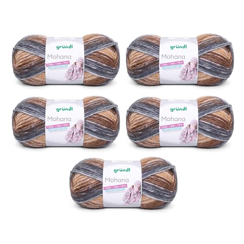 Gründl Ull Mohanna stick- och virkgarn tillverkat av 90% polyakryl, 10% mohair, 5 x 100 g, tjock ull, grå-kamel-brun