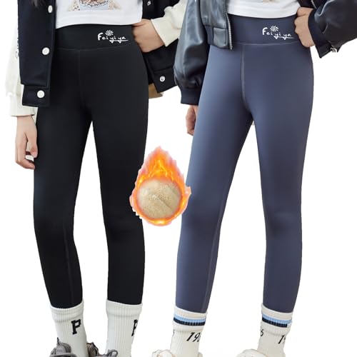 Aiseyi Termoleggings för flickor, tjocka, termiska leggings i bomull, fodrade leggings, barn, vinter, varma leggings, vinterbyxor, svart, 130