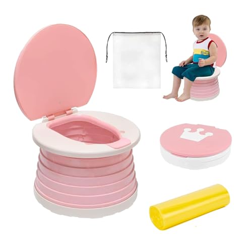 Potta vikbar toalett barn, hopfällbar toalett för barn, hopfällbar toalettsits med soppåsar, vikbar toalettsits, bärbar resehopfällbar potta för inomhus och utomhus 0–8 år (rosa)