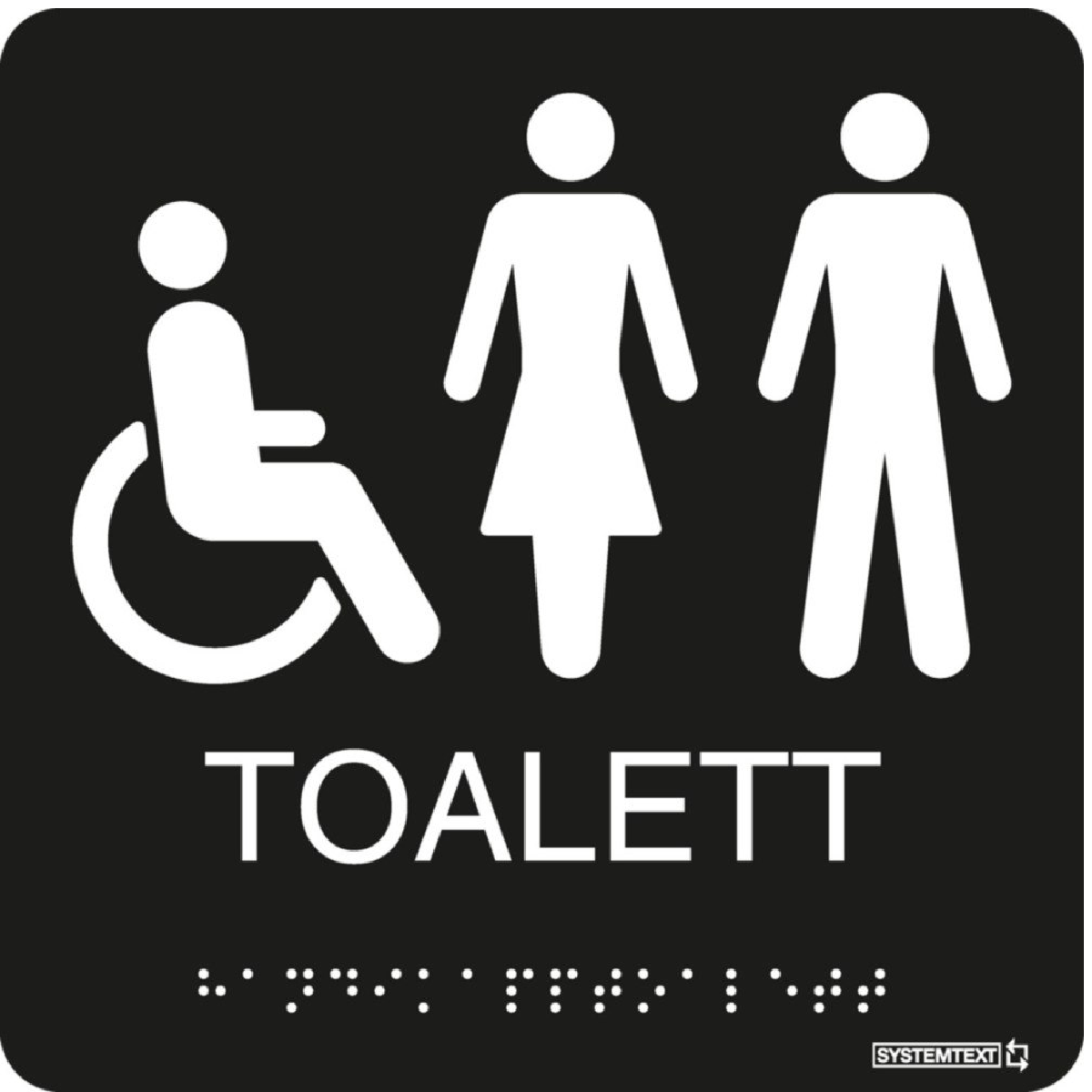 Taktil skylt "Toalett Rullstol/Dam/Herr" Svart