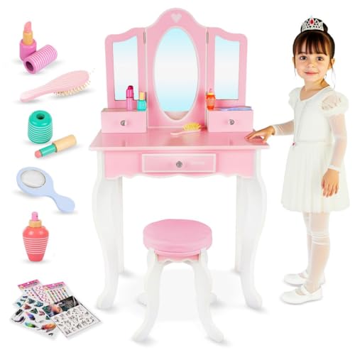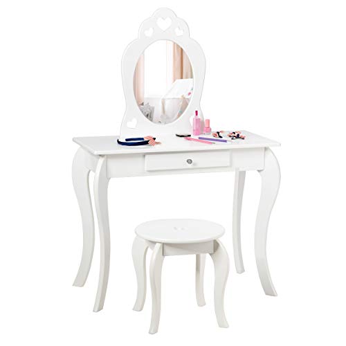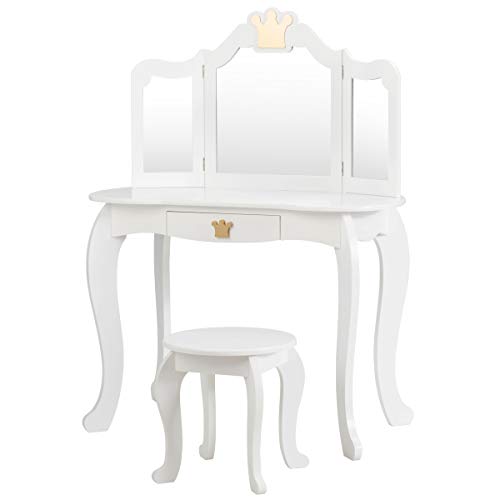 GIANTEX Sminkbord för barn med pall, sminkbord, kosmetikabord med lådor, löstagbar spegel, toalettbords-set för flickor, toalettbord, trä (vitt)