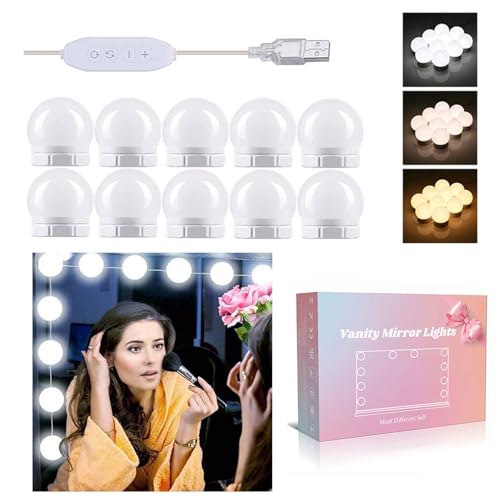 Hollywood spegellampor fäster på 10 glödlampor, USB-kabel justerbar, 3 färgväxlande och 10 ljusstyrkor, LED sminkspegellampor dimbar, sminklampor för toalettbord (ingen spegel och adapter)