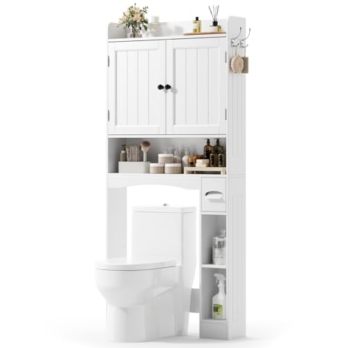 Xbro WC överbyggnadsskåp över toalett, fristående toaletthylla med 2 dörrar, justerbara hyllor och näsdukslåda, tippsäker, för badrum och tvättstuga, 69 × 29 × 169 cm, vit