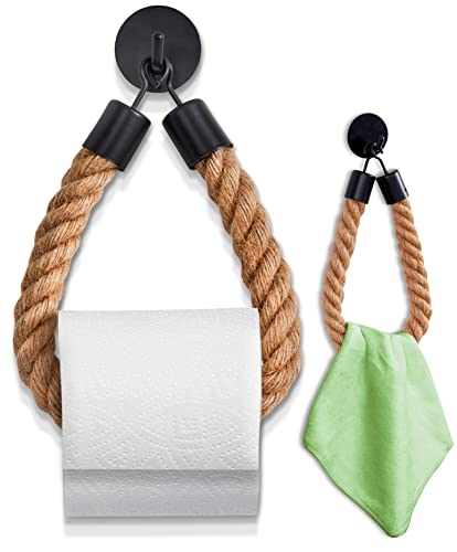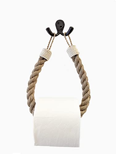 ACL Rep svart toalettrullehållare/handdukshållare med vita knutar, retro stil väggmonterad jute toalettpappershållare, rustik bohemisk design nautiskt tema badrumstillbehör (jute vit knut)