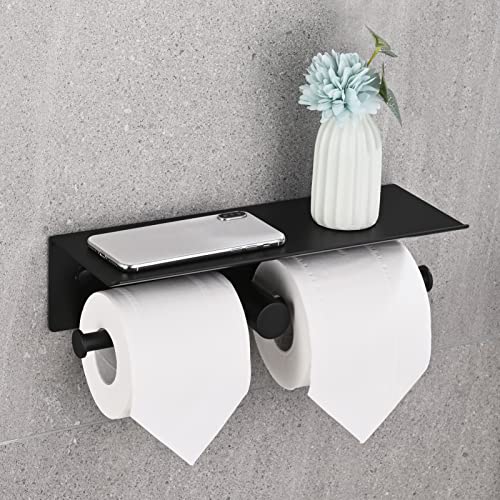 HANFU Dubbel toalettrullehållare, toalettpappershållare, självhäftande ingen borrning med rymlig hylla 31 cm, aluminium väggmonterad toalettpappershållare för badrum tvättrum kök, svart