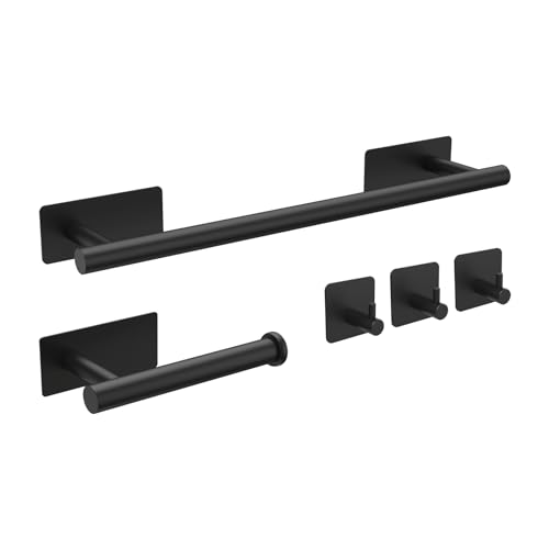 Ibergrif 5 st badrumstillbehör set, svart toalettrullehållare, handduksskena, krok, väggmonterad eller självhäftande, ingen borrning M34452B