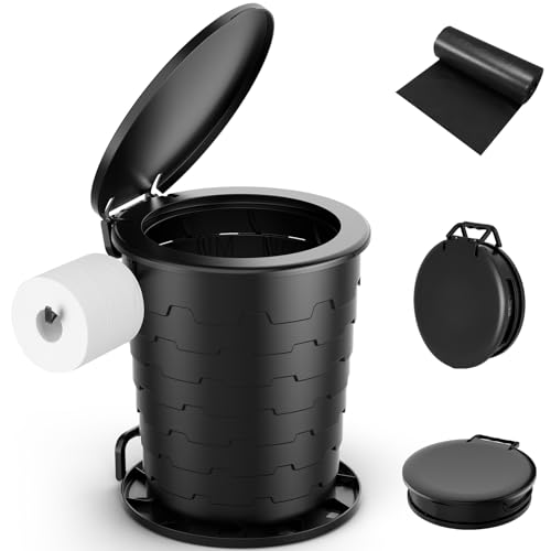 WADEO Uppgraderad hopfällbar campingtoalett, hopfällbar potta med lock och toalettrullehållare, bärbar rese-wC för camping, resa, bil (svart - infällbar)