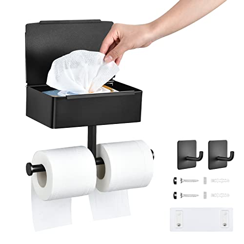 OTraki Toalettrullehållare väggmonterad självhäftande 2-i-1, dubbla rullar toalettpappershållare med hylla och våtservetter dispenserlåda, rostfritt stål näsduksförvaring för WC badrum tvättrum kök