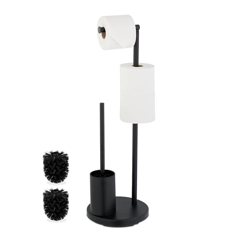 Relaxdays toalettrullehållare och borstset, rostfritt stål, HxD 68 x 22 cm, fristående badrumspapperstativ, svart, järn, skum