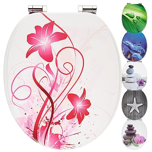 Toalettsits med automatisk sänkning | Träkärna | stabila mjuka stängande gångjärn | enkel montering | slät yta | fina motiv att välja mellan | Toalettlock i trä universellt passande (rosa blommor)