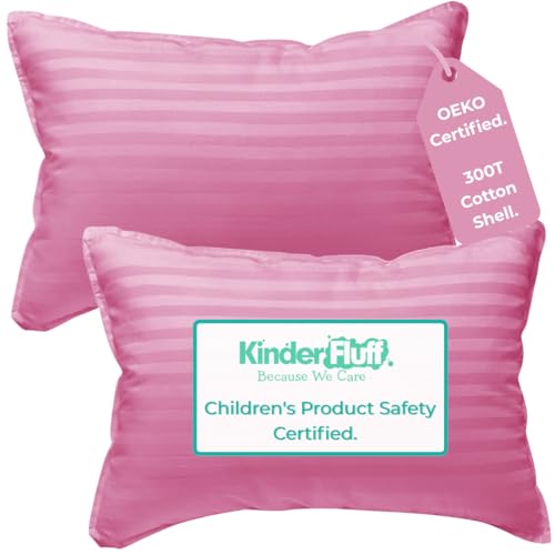 kinder Fluff Toddler Pillows for Bed (2X) - The Only 300T Cotton Shell & Down Alternative Fill - Travel Pillow for Children Bedding Set Sleeping and Floor Bed (14x20in - Pink)