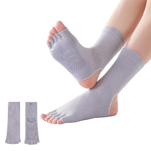 CoziSox 2 Pairs Women Yoga Pilates Socks Five-Toe Open Toe Non-Slip with Handle Breathable Cotton Pilates Barre Yoga Ballet AU 4-8, all grey, One size