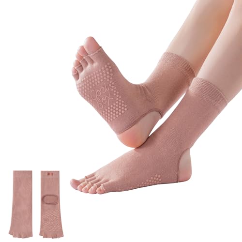 CoziSox 2 Pairs Women Yoga Pilates Socks Five-Toe Open Toe Non-Slip with Handle Breathable Cotton Pilates Barre Yoga Ballet AU 4-8, biege, One size