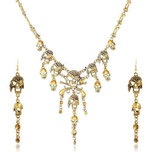Pirat Halsband Skalle Tofs Charm Krage för Kvinnor - Skräck Punk Piratkostym Damer, Pirattillbehör (Guld), 4m Zuleitung mit Kinderschutz