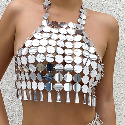 CABODYALS 1 st silver paljetter bikini topp sommar strand tofs plast klänning grimma rygglös crop top bh sexig kropp kedja ihåliga linnen smycken bröstkedjor för kvinnor nattlinne
