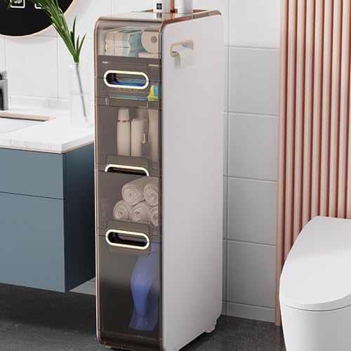 Bathroom Floor Cabinet, Narrow Slim Storage Cabinet with Toilet Paper Holder and 2 Casters, Plastic Bathroom Cabinet for Small Spaces,White,4 Drawer