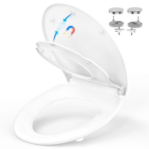 CUQOO Oval toalettsits mjuk stängning – snabbfrigörande toalettsits – O-formad mjuk stängning toalettsits vit – långsam stängning toalettsits med justerbara gångjärn (klassisk komfort)