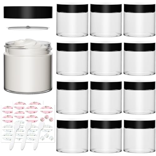 Flintronic 12 stycken burkar, 50 ml plastburkar, tomma burkar, klar degel, krämburk, tom transparent degel med spatel och etikett, resepotta, set för miniljus, kosmetika