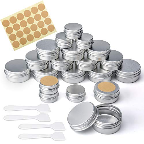 Firschoie 20 st tomma kosmetiska burkar i aluminium, 20 ml miniburk med skruvlock, tom burk med 28 runda klistermärken och 4 spatlar, perfekt för smink, krämer, lotion