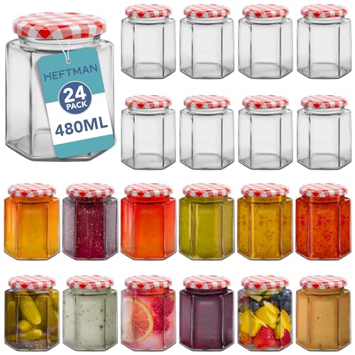HEFTMAN Små glasburkar med lock, 24-pack, lufttäta syltburkar, 480 ml, med röda ginghamlock, inläggningsburkar, glas för ljustillverkning, konservglas, hexagonformade små burkar (tomma).