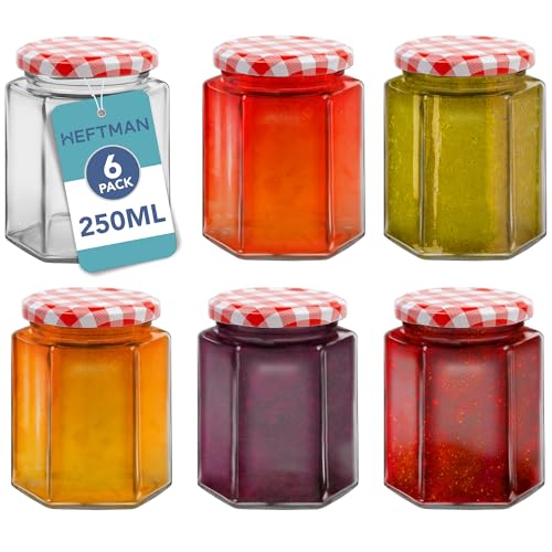 HEFTMAN Små glasburkar med lock, 6-pack, lufttäta syltburkar, 250 ml, med röda ginghamlock, inläggningsburkar, glas för ljustillverkning, konservglas, hexagonformade små burkar (tomma)