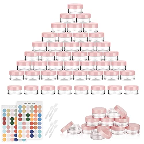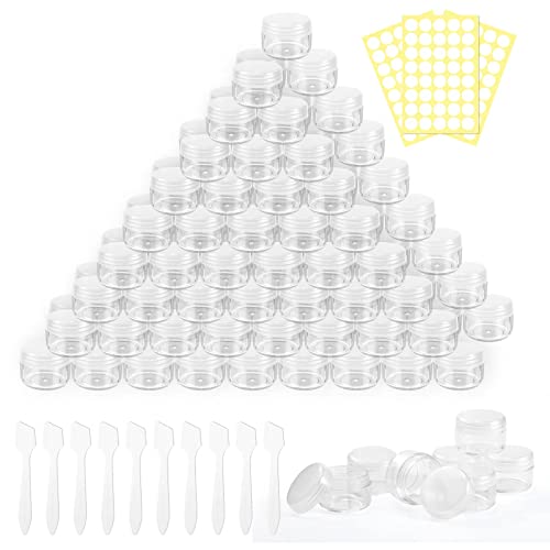 RVLZKCPG 60 stycken burkar, 5 ml krämburkar för fyllning, transparent burk, tomma krämburkar med skruvlock, små burkar med lock plast med spatlar klistermärken för krämer lotion läppbalsam