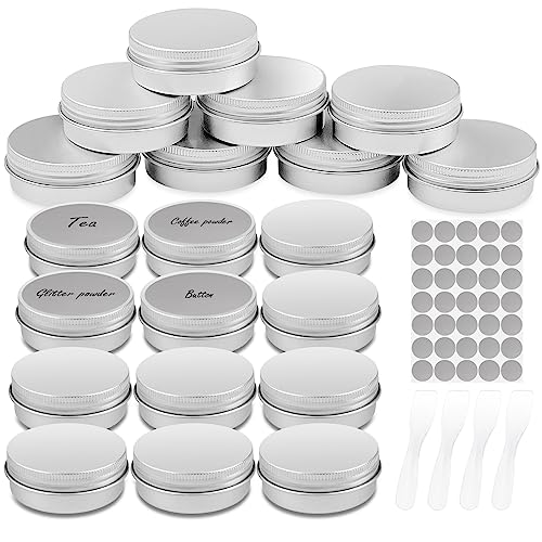15 stycken tomma aluminiumburkar, 60 ml runda resekrämburkar för fyllning, degel för kräm med spatel, etikettklistermärken, små burkar med lock för kräm, kosmetika, mynt