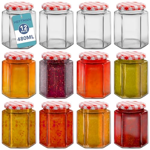 HEFTMAN Små glasburkar med lock, 12-pack, lufttäta syltburkar, 480 ml, med röda ginghamlock, inläggningsburkar, glas för ljustillverkning, konservglas, hexagonformade små burkar (tomma).