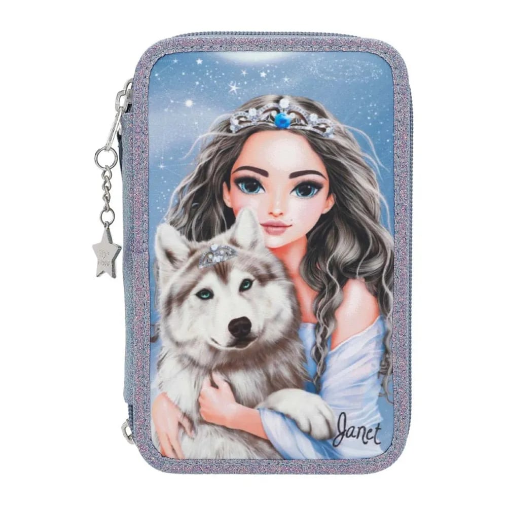 Depesche 13149 TOPModel Wolf-fyllt 3-fack pennfodral i mörkblått, med modellmotiv, stjärnor och glitter, pennfodral med färgpennor, linjal, sax UVM, blå