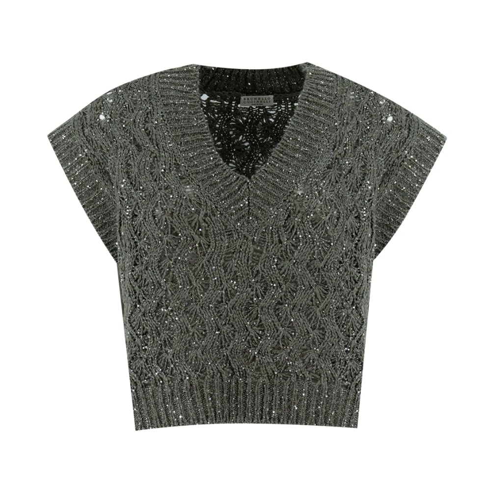 Brunello Cucinelli, Stickade Tröjor , Dam, S, Paljetter, Ärmlös V-ringad Topp