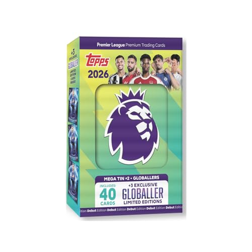 Topps Premier League 2026 – debututgåva – Mega Tin (Globallers). Innehåller 40 kort plus 3 Globallers LE-kort.
