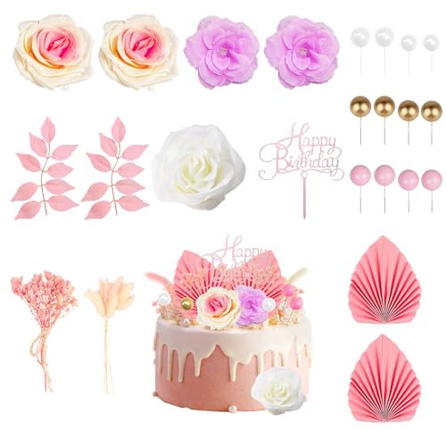 36 stycken tårtdekoration blommor boho tårtdekoration, konstgjorda rosenblad blad palmfack torkade gräs tårtbollar kakkort, återanvändbar dekorativ tårta för fest bröllop födelsedag