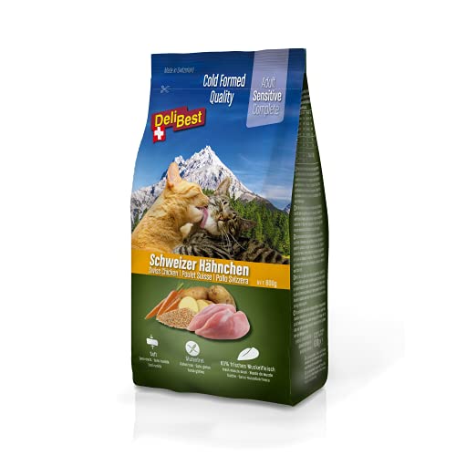 DeliBest Adult Sensitive Complete Cat kyckling I torrfoder för katter I tillverkad av 100% schweiziskt kycklingkött I kornfritt och utan tillsatser I Kattmat kallpressad I 600 g