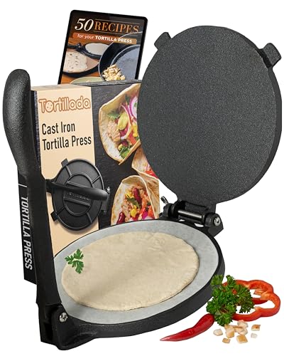 Tortillada - Tortillapress i Gjutjärn 25 cm – Tortilla Maker för Tacos, Wraps och Flatbröd – inkl. Recept E-bok och 100 Ark Bakplåtspapper – Robust Press