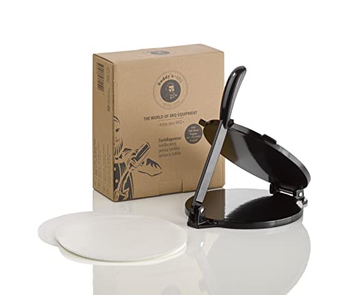 Buddy´s BBQ – Tortillapress, tortillas, tacos, enchiladas, burritos non-stick, gjutjärn, svart, innehåller 100 ark papper, Ø 20 cm