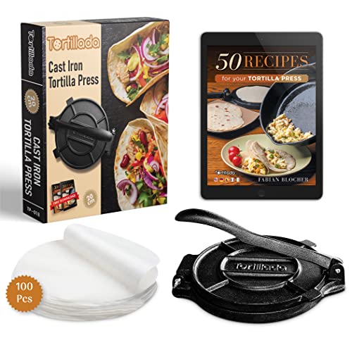 Tortillada - Tortillapress i Gjutjärn 20 cm – Tortilla Maker för Tacos, Wraps och Flatbröd – inkl. E-bok och 100 Ark Bakplåtspapper – Robust Tortillapress