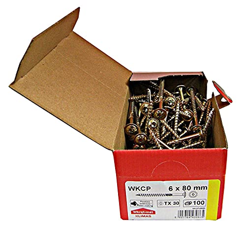 KLIMAS Torx träskruvar – tallrikshuvudsskruvar TX gula skruvar – platta huvudskruvar trä – Torx skruvar set – 6 x 80 mm – 100 stycken