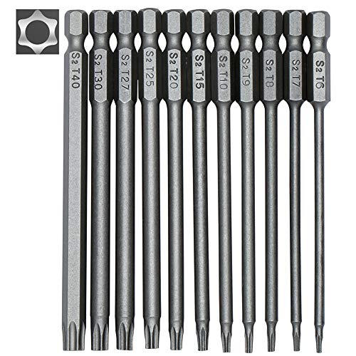 11 stycken torx långa skruvmejslar bitsset, 1/4 tum magnetiskt stjärnhuvud skruvdragningsset T6-T40 sexkantigt skaft elektrisk torx bits sats verktyg, 75 mm lång