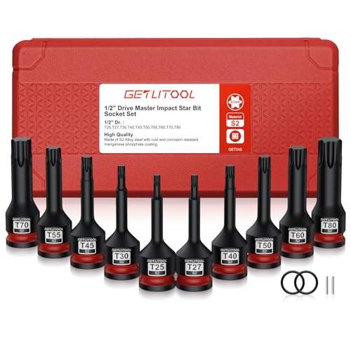GETLITOOL 1/2 tum kraft torx bit slagnyckel nötsats, 10 delar S2-stålbit insats sats T25 – T80, längd 78 mm hylsnyckelsats för Torx-skruvar